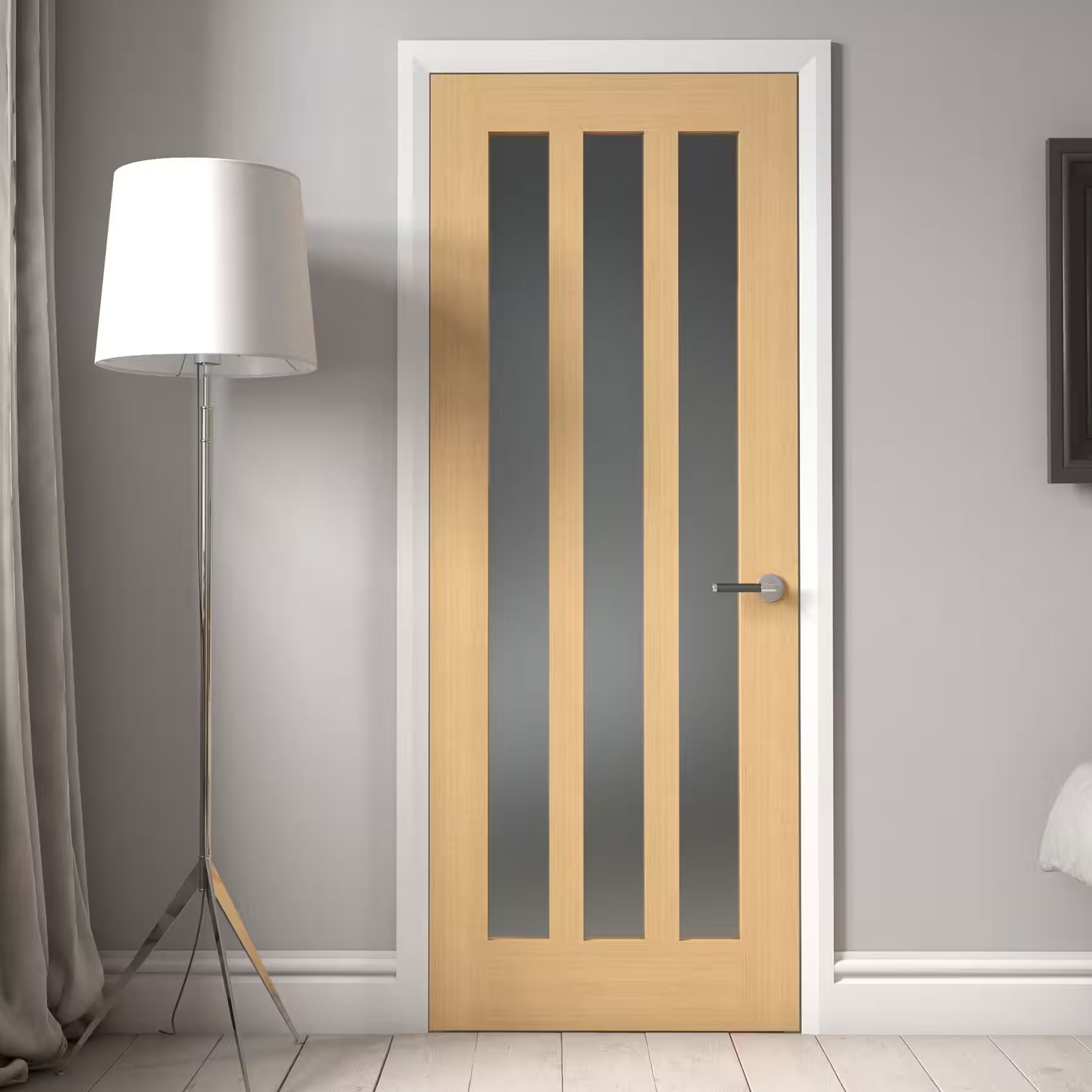 The Aston Oak Frosted Glazed Door is designed to balance light and privacy. Featuring three streamlined panels of toughened frosted glass, it meets all current UK Building Regulations while offering a discreet finish that softens visibility between rooms. An ideal choice for connecting spaces where you want natural light to flow without compromising privacy.