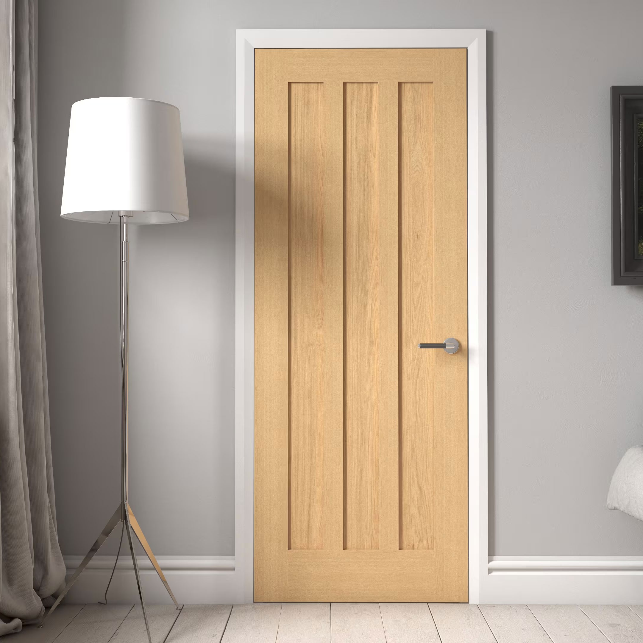 The Aston Oak Panel Door offers a refined twist on the classic Mexicano style. Crafted with premium American white oak veneer, its three-panel design features Shaker-inspired square corners and deep grooves for a bold yet understated look. Supplied unfinished, it gives you complete freedom to customise—highlight the natural grain with a soft stain or lacquer, or prime and finish in a colour that complements your décor.