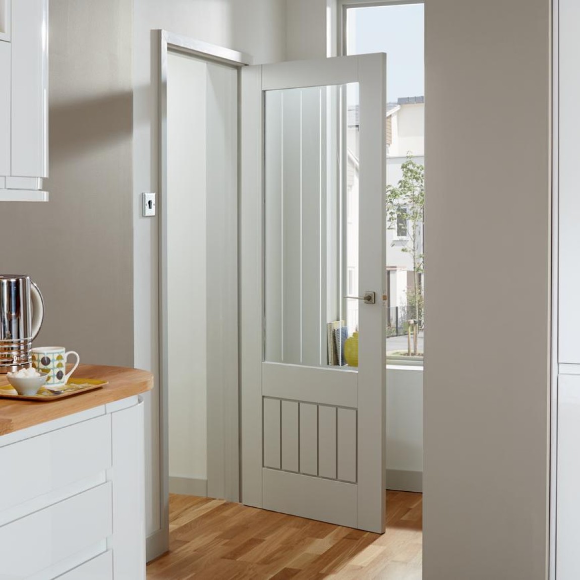 Features glazed panels that allow natural light to flow between rooms, creating a brighter and more open feel. The glass is securely fitted for durability while adding a touch of elegance to any space.