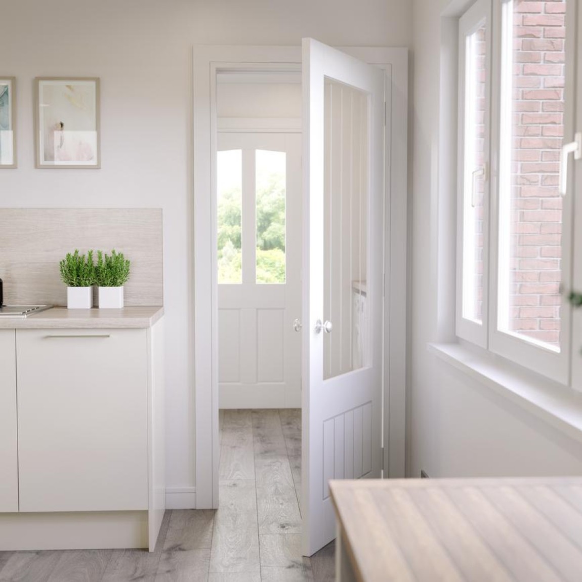 Etched with subtle vertical lines to mirror the tongue-and-groove detail below, the glass adds visual continuity and style. The door is supplied primed and ready to paint, making it easy to customise and saving time on finishing. A lightweight yet stable particleboard core ensures easy handling, and multiple widths are available for a precise fit.