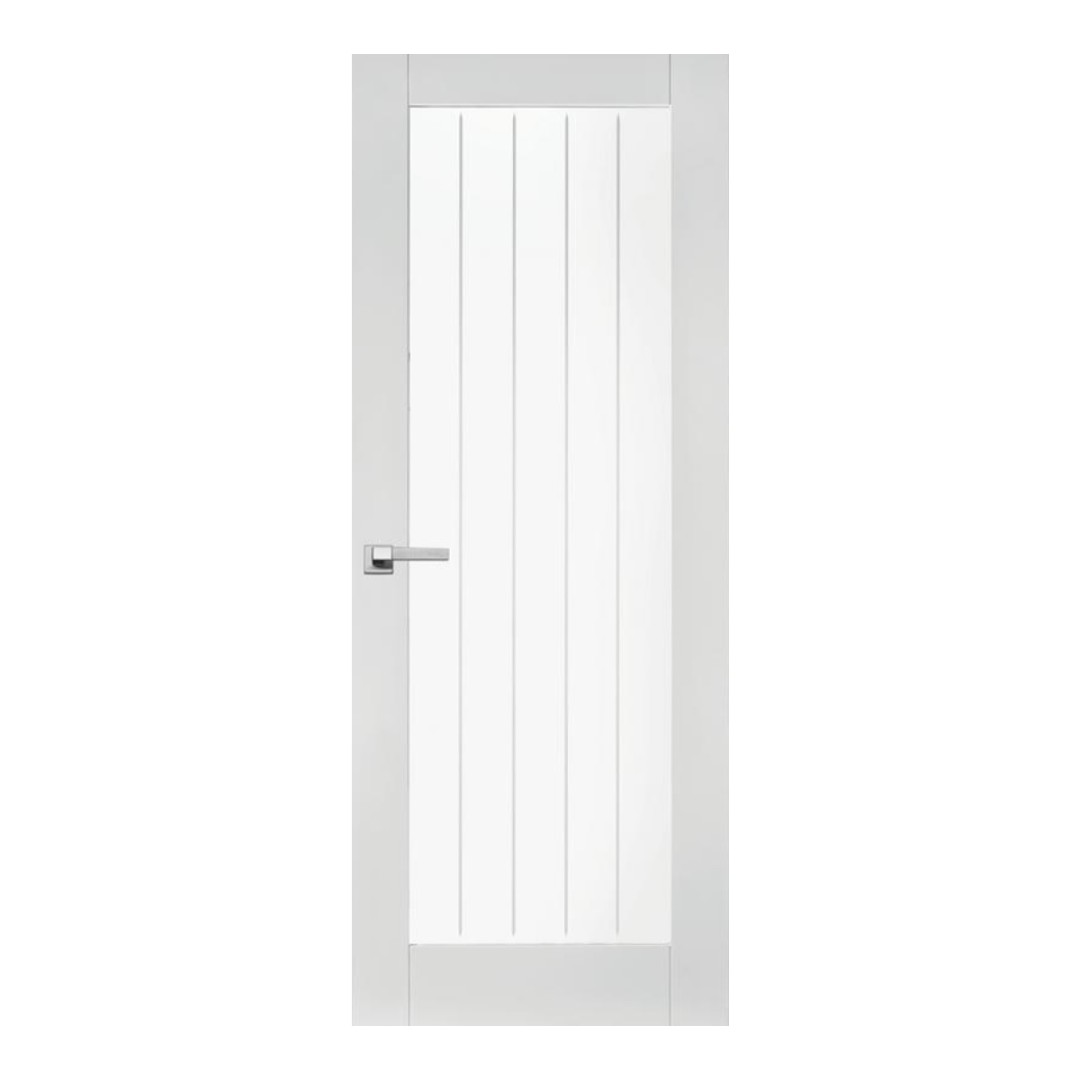 A large glazed panel allows light to flow between rooms, while etched vertical lines on the glass echo the classic tongue-and-groove design for a subtle, modern touch. Supplied pre-finished for quicker installation, it’s available in a range of widths to suit various layouts.