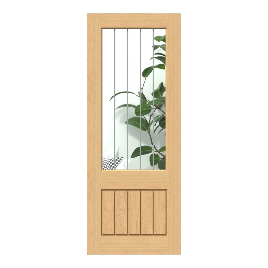 Introducing the latest addition to our popular Mexicano Oak Collection. The Mexicano Oak 2XG is a pre-finished glazed oak door featuring a large clear glass panel with elegant frosted lines for a distinctive look. Designed to bring light and character into your home, this contemporary twist on a classic style is ready to install and built to last.