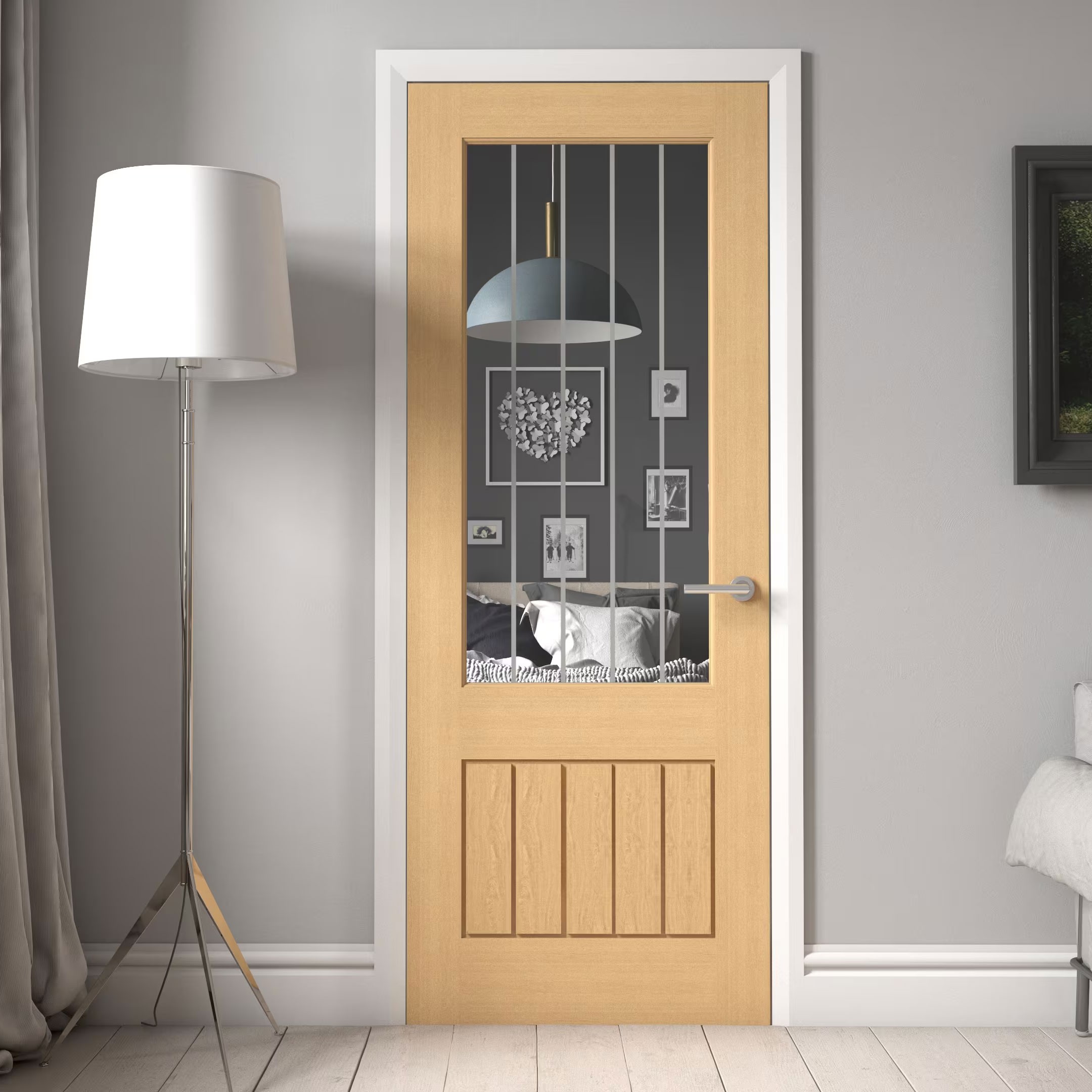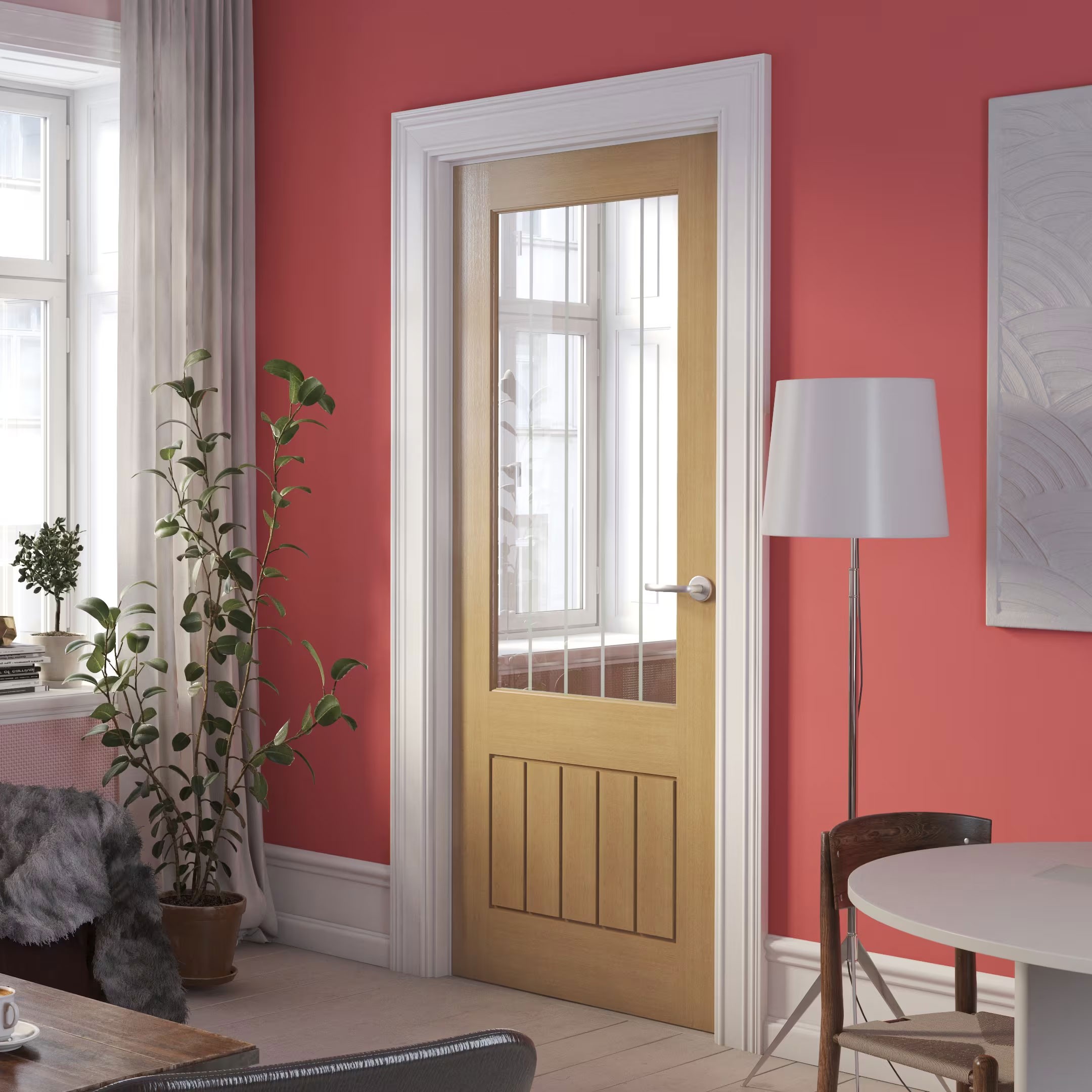 Features glazed panels that allow natural light to flow between rooms, creating a brighter and more open feel. The glass is securely fitted for durability while adding a touch of elegance to any space.