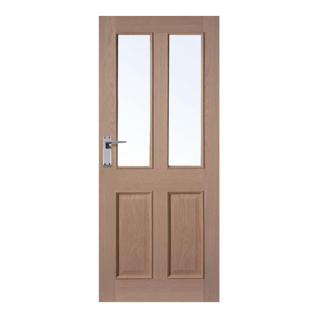 Our four-panel glazed doors offer the timeless elegance of oak tones, featuring two large bevelled glass windows that brighten and open up any space. The clear glass is pre-installed for your convenience, allowing for a quick and easy fitting. Finish the doors with varnish or stain to enhance the natural beauty of the wood and ensure it stays looking its best for years to come.