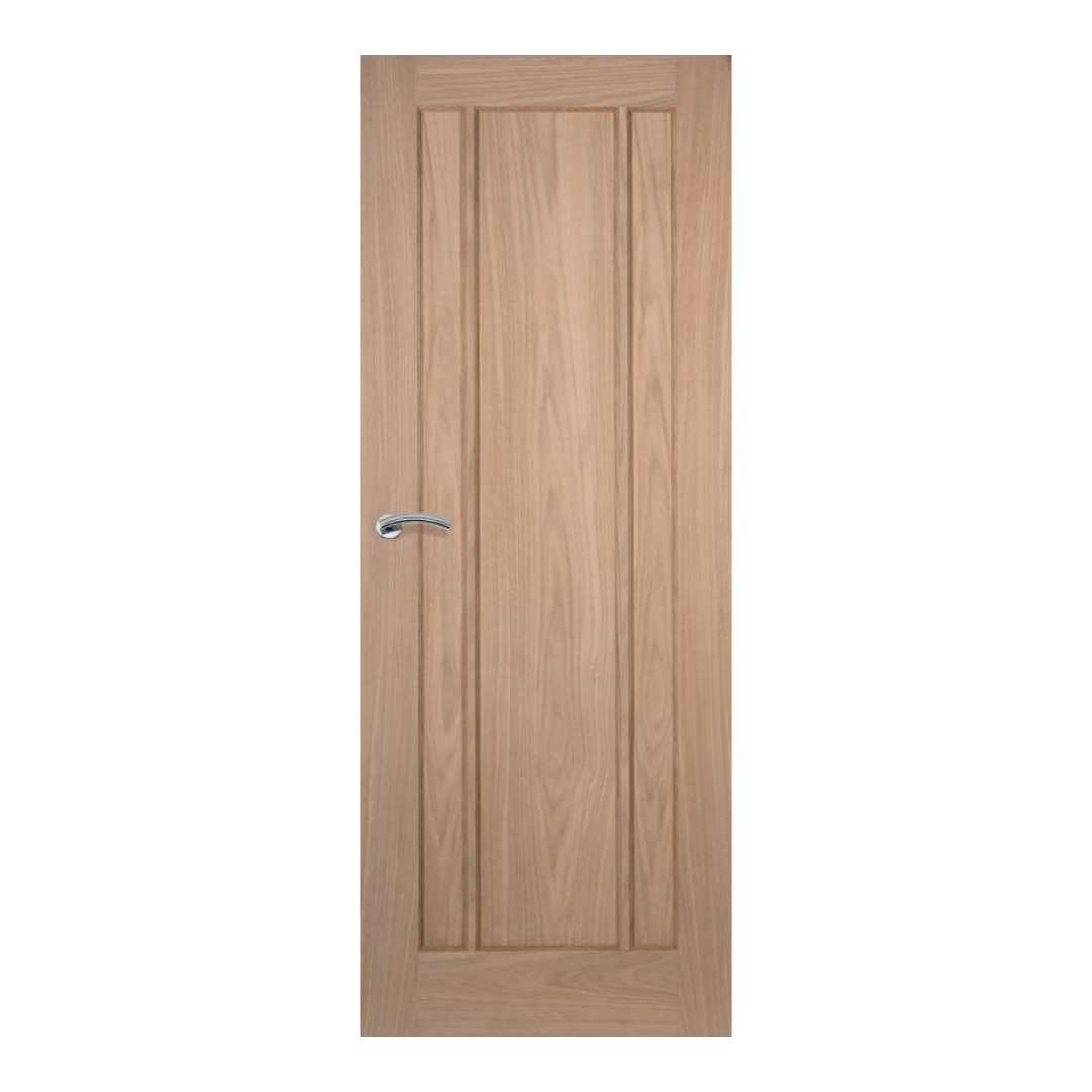 This premium oak door features a classic panel design that adds an air of sophistication to any space. Built with an engineered core to prevent warping, it also comes in fire door variants for added safety. The outer surface is crafted from American white oak, showcasing beautiful pale wood tones and natural grain patterns, offering both style and durability.